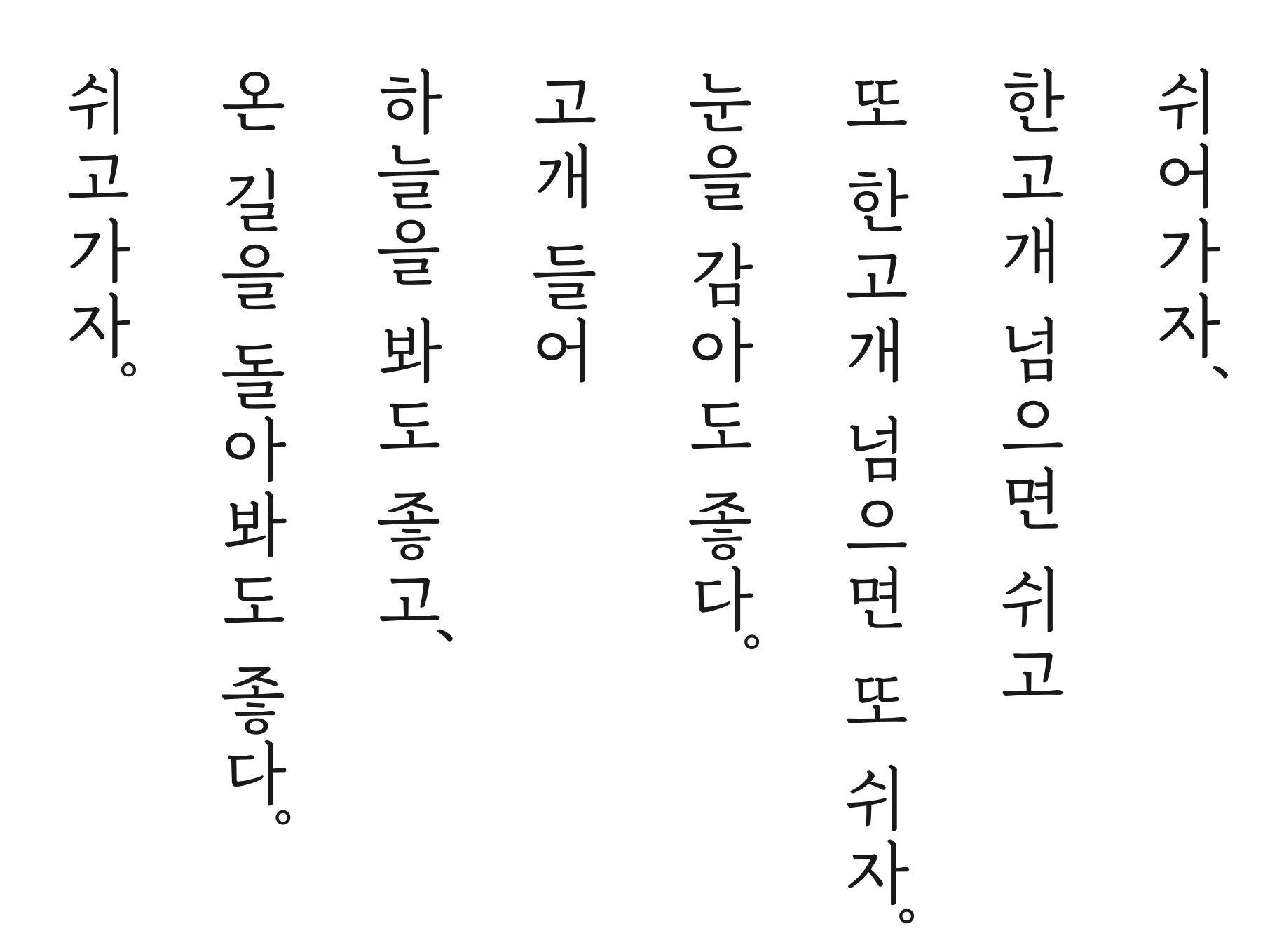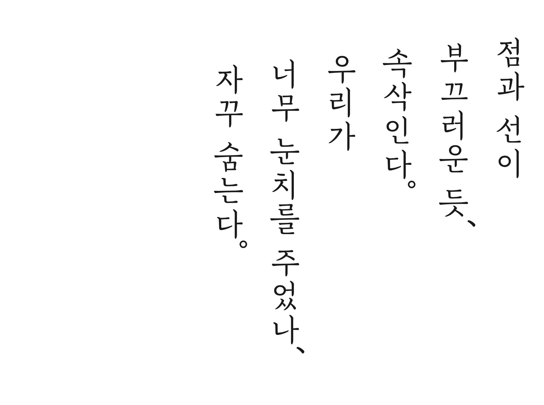 ‘잉크를 아끼는 글자’는 이미 너무 오래전 작업이지만, 지금도 저에게는 실천 방향입니다. 다행히, 나이가 든 탓인지, 이제는 ‘새로운’ 것에 집착하기보다 ‘필요한’ 것을 더 많이 생각합니다. 활자디자이너로서 교육자로서 내 역할이 무엇인지 찾고 그것을 수행하고자 할 뿐입니다. 그리고 고유한 ‘창작’은 그 순간 만들어질 수 있다고 믿습니다. 특별히 주목받지 못했을지라도, 제가 그동안 필요하다고 생각하여 만든 작업을 몇 가지 말씀드리겠습니다.