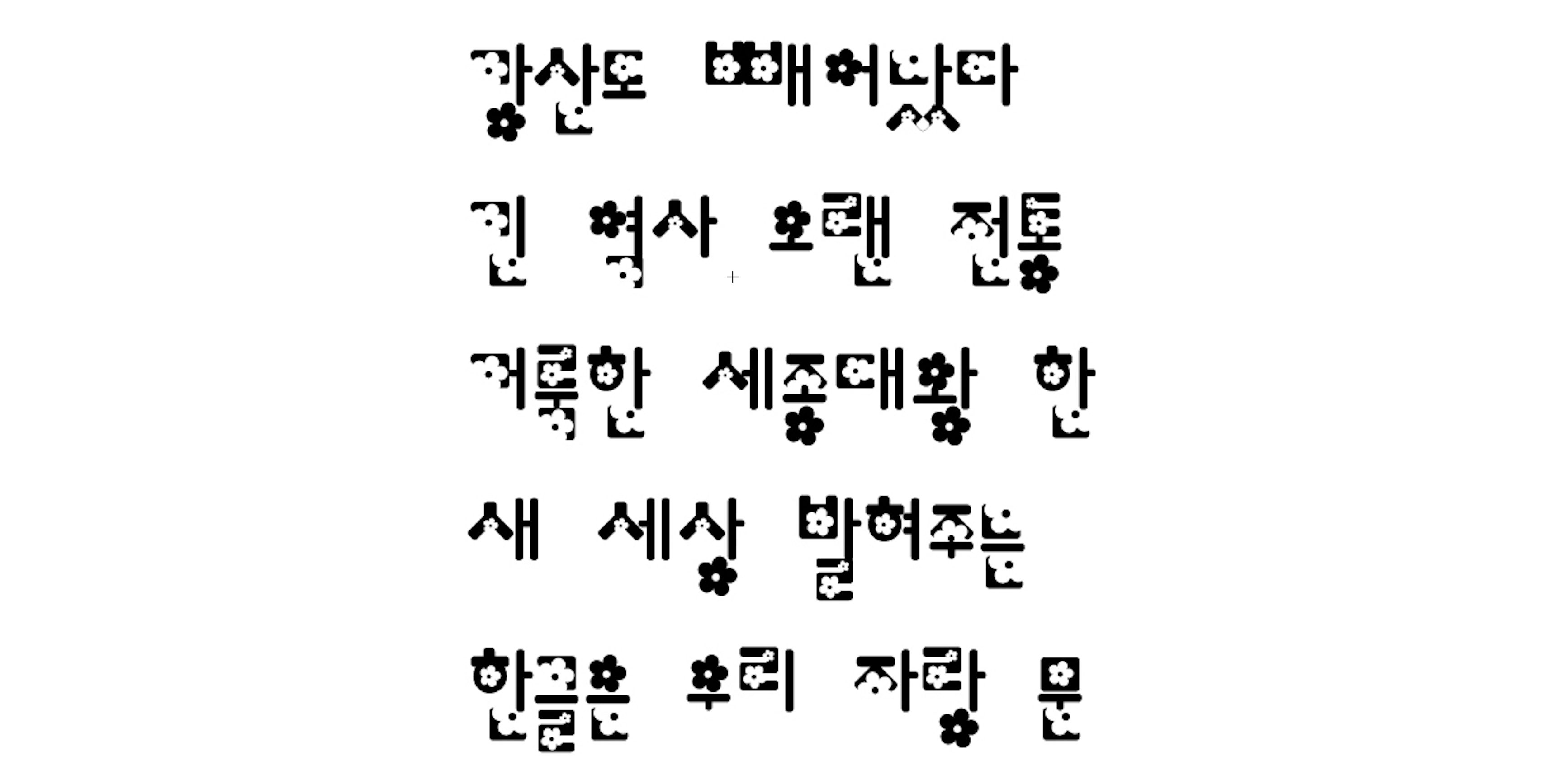 좀 창피하지만, 그래서 저도 박우혁을 따라 별로 글자를 그려봤습니다. 크고 작은 별들로 [ㄱ, ㄴ, ㄷ…, ㅏ, ㅑ, ㅓ…]를 그렸는데, 역시나 제가 그린 별 글자체는 재미가 없었습니다. 사람들에게 보여줬을 때 반응도 ’별’이라는 소재에 대한 호감은 있지만, 재밌어하지는 않았습니다. 그 뒤에, 다시 한번 시도한 것이 [꽃]입니다. 사람들에게 ‘별’만큼 호감을 주는 소재가 ‘꽃’이라고 생각해서 글자에 꽃을 그려 넣으면 예쁘지 않을까 상상했던 것입니다. 세벌식으로 글자를 그리고 글자에 꽃을 그려 넣었지만, 이 역시 예쁘지 않았습니다.